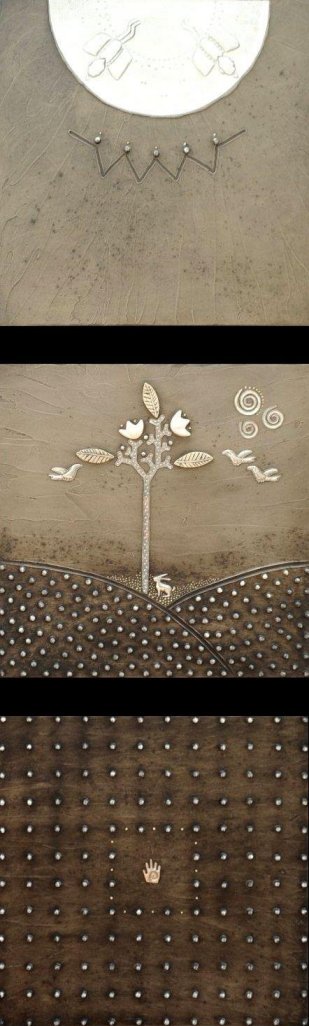 pewter, ceramic and acrylic on board